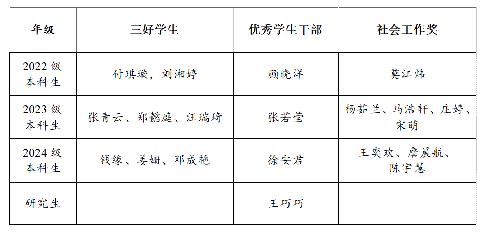 根据《milan米兰官网学生资助工作管理规定》《milan米兰官网学生评优工作条例》,结合学校《关于开展2024-2025学年三好学生、优秀学生干部、社会工作奖评审工作的通知》具体要求,经学生个人申报、班级推荐审核、学院评奖评优工作领导小组审定,学院2024-2025年度三好学生、优秀学生干部、社会工作奖评审结果如下(排名不分先后):